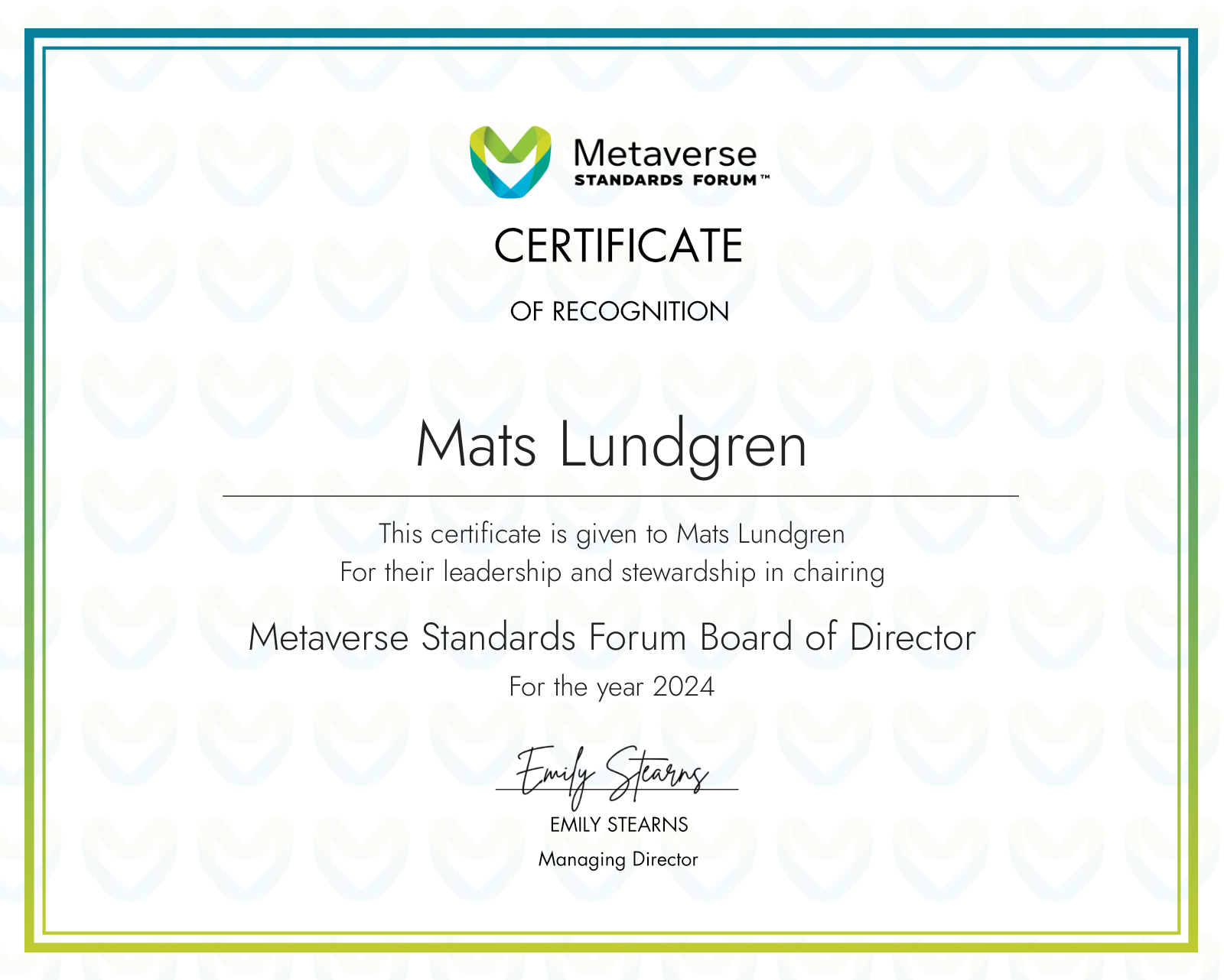 Metaverse Standards Forum Certificate of Recognition